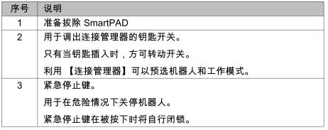 smartPAD 已拔出,則無法再通過 smartPAD 上的緊急停止按鍵來使設備停機。 因此必須在機器人控制系統(tǒng)上外接一個緊急停止裝置。運營商應負責將已拔出的 smartPAD 立即從設備中撤離并將其妥善保管。保管處應遠離在工業(yè)機器人處作業(yè)的工作人員的目視和作用范圍。 其中目的是為了防止有效的和無效的緊急停止裝置被混淆。如果沒有注意該措施, 則有可能造成人員嚴重身體傷害乃至致命或者巨大的財產損失。